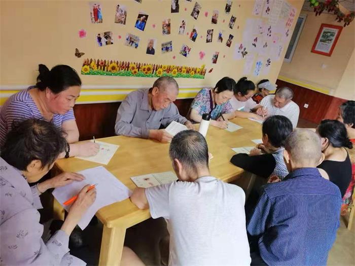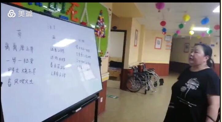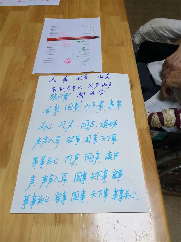 壽而康認知癥照護區在曹野董事長(cháng)的嚴格要求及指導下,開(kāi)設的“七彩課堂”之語(yǔ)文課、國學(xué)課、英語(yǔ)課等,都是訓練認知癥老人的發(fā)音、朗讀、認字等能力,從而達到語(yǔ)言訓練目的,鼓勵老人多說(shuō)話(huà),多讀書(shū),接受來(lái)自外界的各種刺激;以認知癥老人能夠接受的方式讓其進(jìn)行交談和互動(dòng),幫助其維持口語(yǔ)和交流能力,通過(guò)朗讀以激活認知癥老人大腦相應的功能。