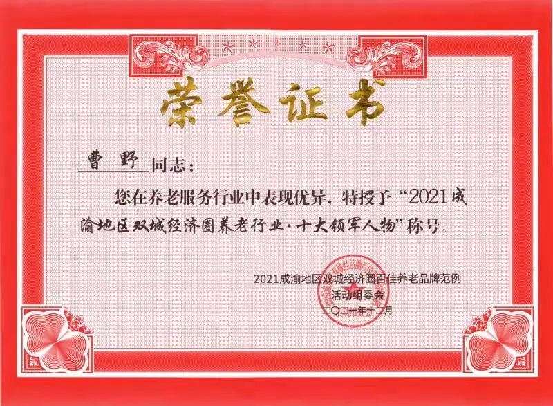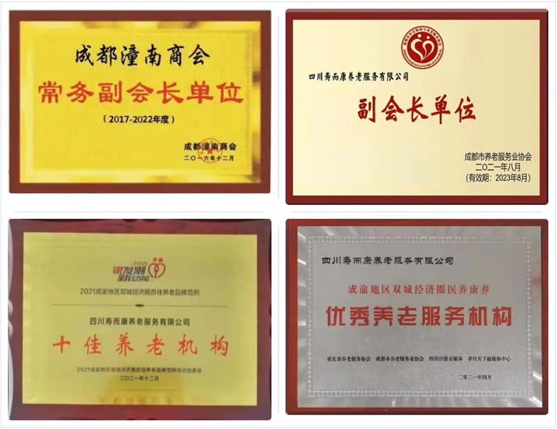 公司成立以來(lái),先后獲得了成渝地區雙城經(jīng)濟圈醫養康養“優(yōu)秀養老服務(wù)機構”,成渝地區雙城經(jīng)濟圈養老行業(yè)“十佳養老機構”,成都市首屆孝行通“優(yōu)秀養老品牌”、成都市養老行業(yè)“發(fā)展貢獻十佳機構”、成都市“愛(ài)心護理院”、成都市養老服務(wù)行業(yè)發(fā)展貢獻“特別榮譽(yù)獎”等稱(chēng)號。